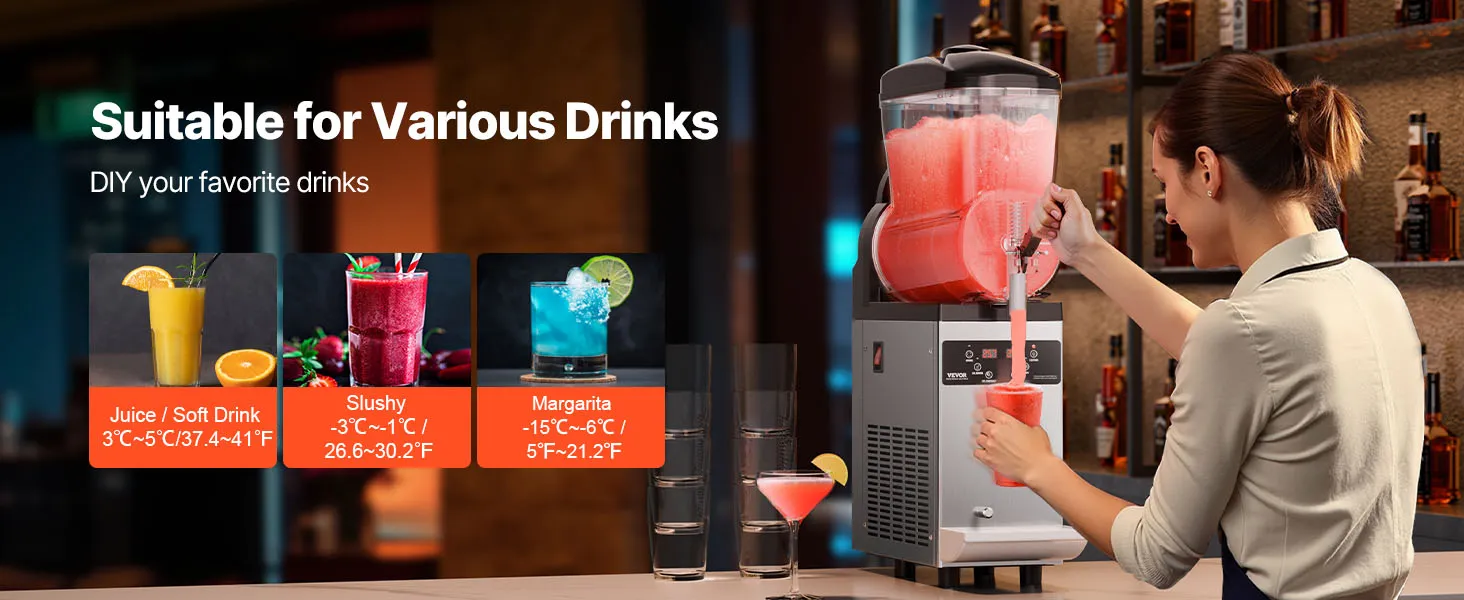 De verbeterde slushmachine heeft een temperatuurregelbereik van -15 tot 10°C, waardoor hij geschikt is voor een verscheidenheid aan dranken, waaronder sappen, ijskoffie, thee en zelfs margarita's.