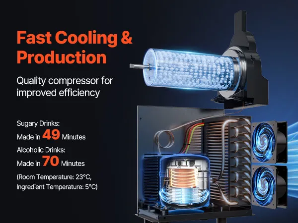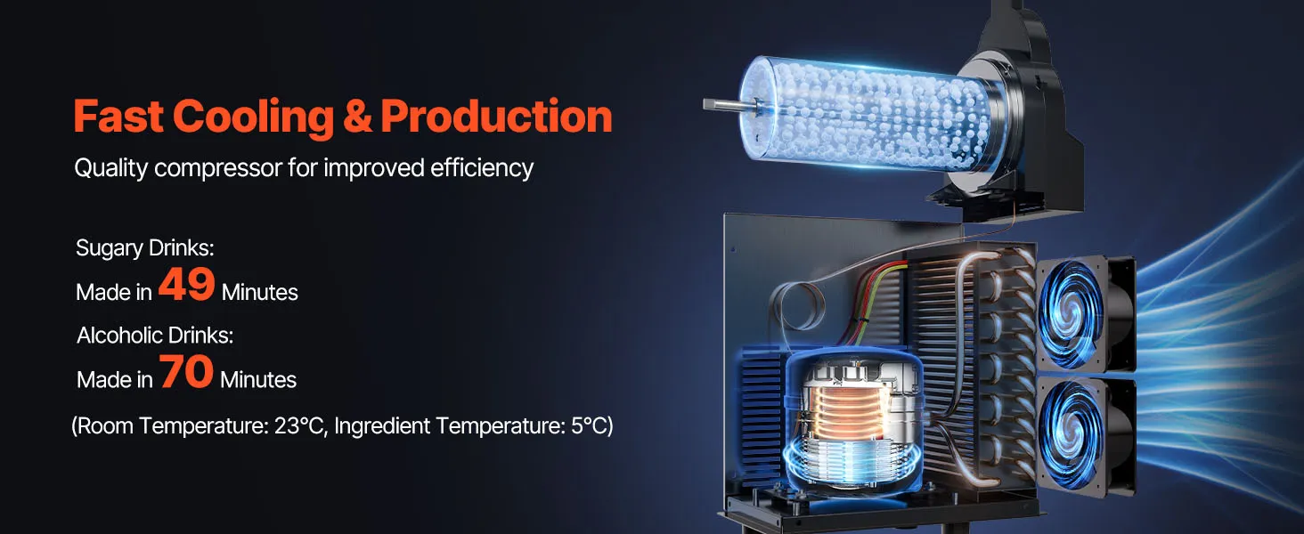 Uitgerust met een hoogwaardige compressor en een geheel koperen condensor koelt deze commerciële slushmachine snel, is energiezuinig, draait stabiel en stil.