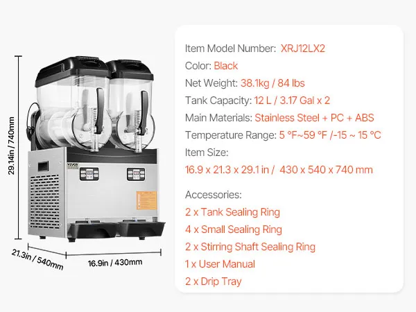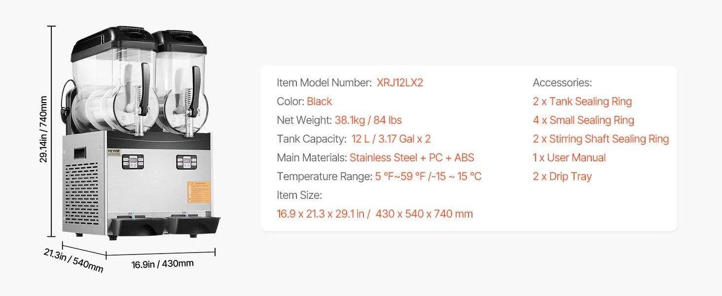 This commercial slushy machine features two 12L / 3.17 GAL capacity tanks, with a stainless steel body and PC tank, offering durable and healthy materials.