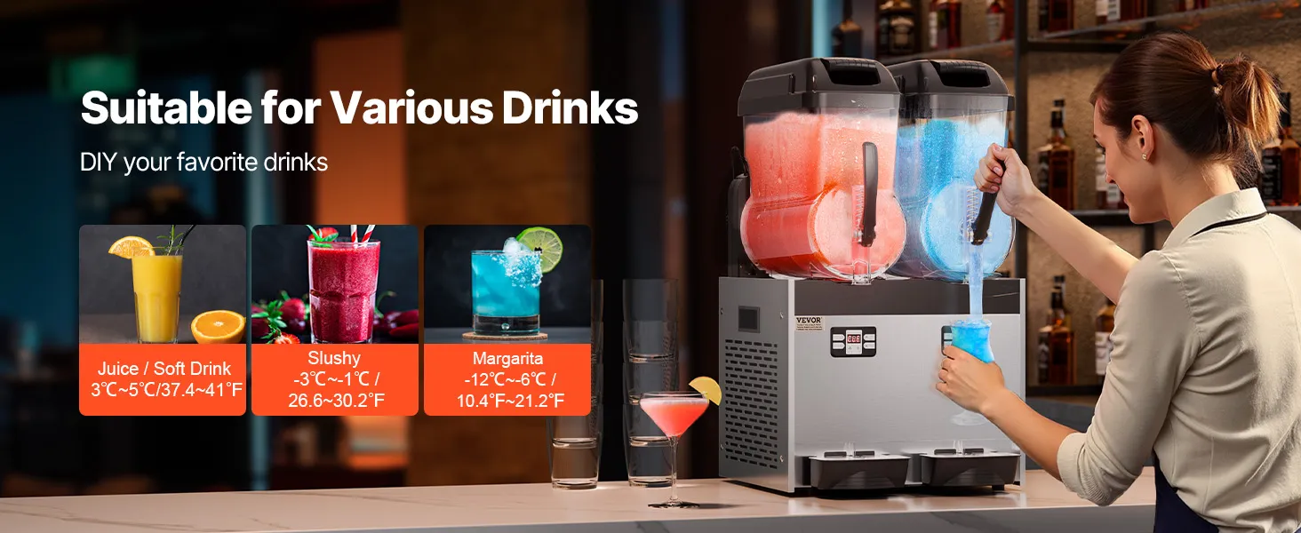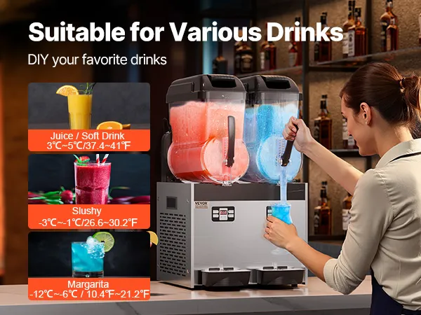 The upgraded slushy machine provides a temperature adjustment range of 5 ~ 59℉ / -15 ~ 15℃, making it suitable for a variety of drinks, including juices, iced coffee, tea, and even margaritas.