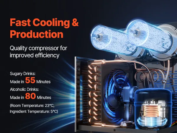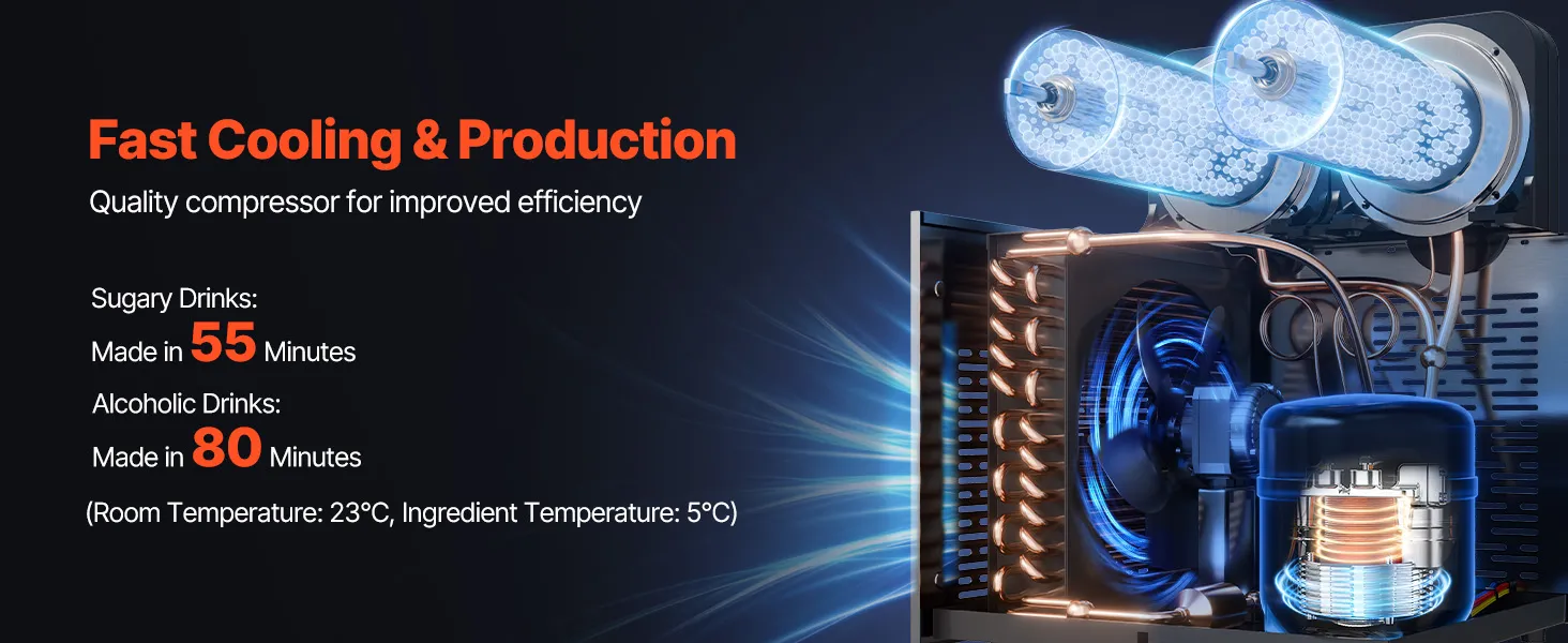 Equipped with a high-quality compressor and a full copper condenser, this commercial slushie machine cools quickly, is energy-efficient, runs stably, and operates with low noise.