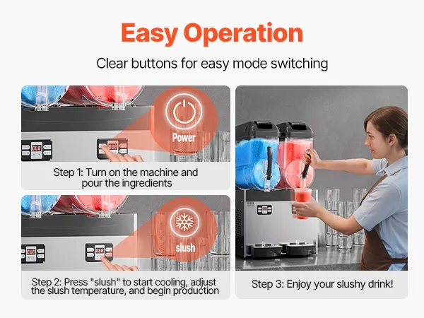 Durable & Easy to Clean: Made with a stainless steel body and food-grade PC tank, this commercial slushie machine is built to last and easy to clean. The tank features one-button automatic cleaning, and the modular components can be easily disassembled without tools for hassle-free maintenance and cleaning.