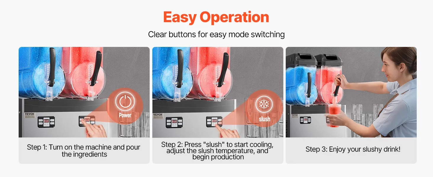 Easy Operation: The user-friendly control panel allows for easy operation, including two mode settings (slushy and cold drink), automatic cleaning, temperature control, and time settings. The temperature is clearly displayed on the digital screen, making it easy to monitor at any time.