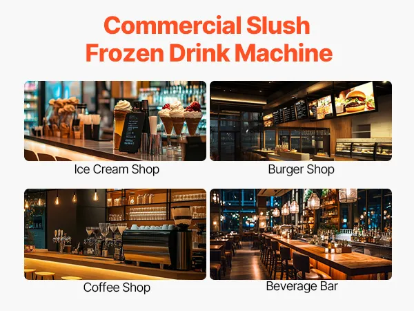 Ideal for use in commercial scenarios such as ice cream shops, burger joints, cafes, bars, and small stalls, this slush machine is perfect for high-traffic areas.