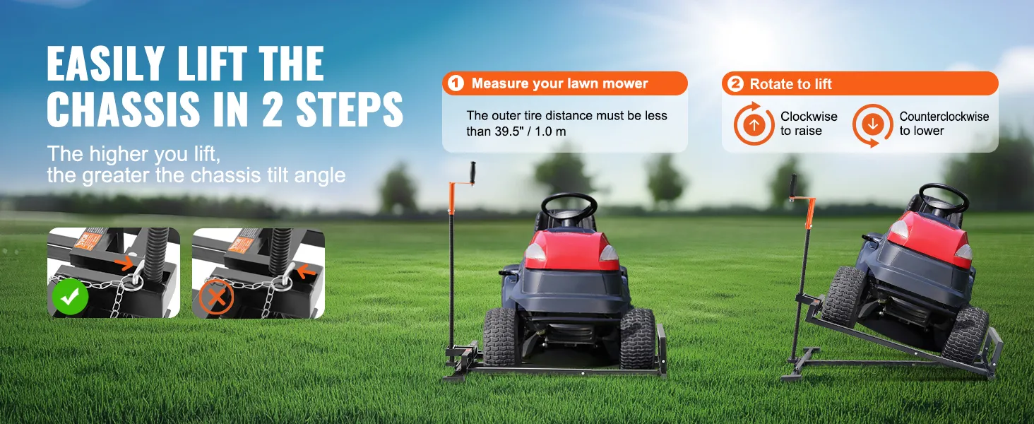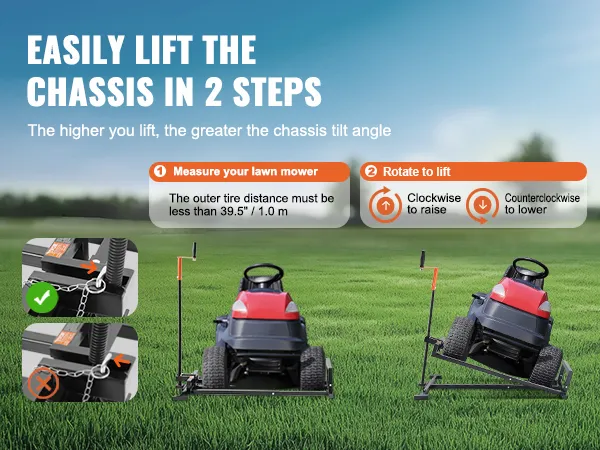 Gemakkelijk optillen: Plaats eerst de banden in het onderframe, dat ruimte biedt aan een maximale bandbreedte van 1,0 m (39,5 inch). Draai vervolgens de hefhendel van de gazontractor eenvoudig met de klok mee om de maaier eenvoudig op 0,6 m (23,6 inch) te brengen onder een maximale hoek van 36°, waardoor u gemakkelijk toegang heeft tot het chassis.