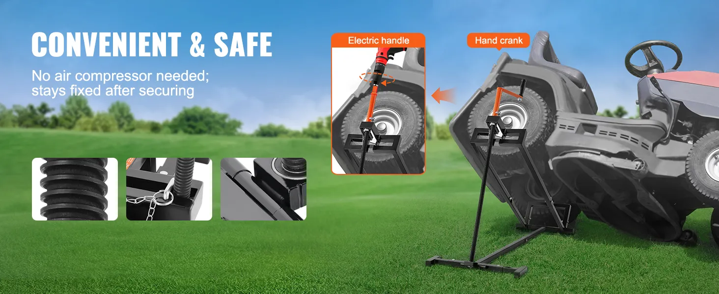 Met twee handgreepopties kunt u zonder gereedschap tillen of snel tillen voor meer efficiëntie. De hefboomwerking verdubbelt uw inspanning. U kunt uw zitmaaier veilig bedienen, omdat deze tijdens het gehele onderhoudsproces veilig op zijn plaats blijft.