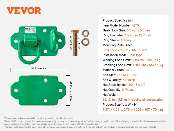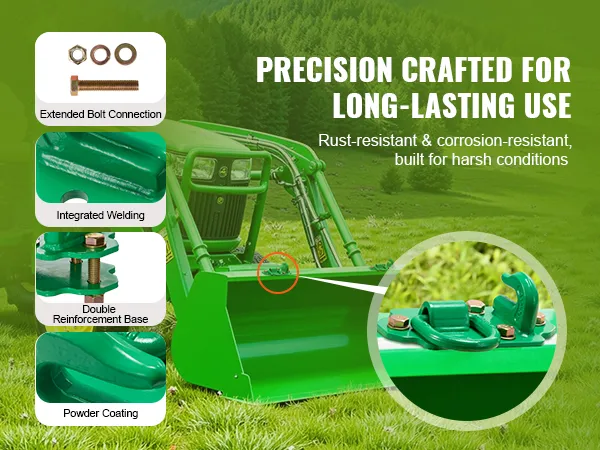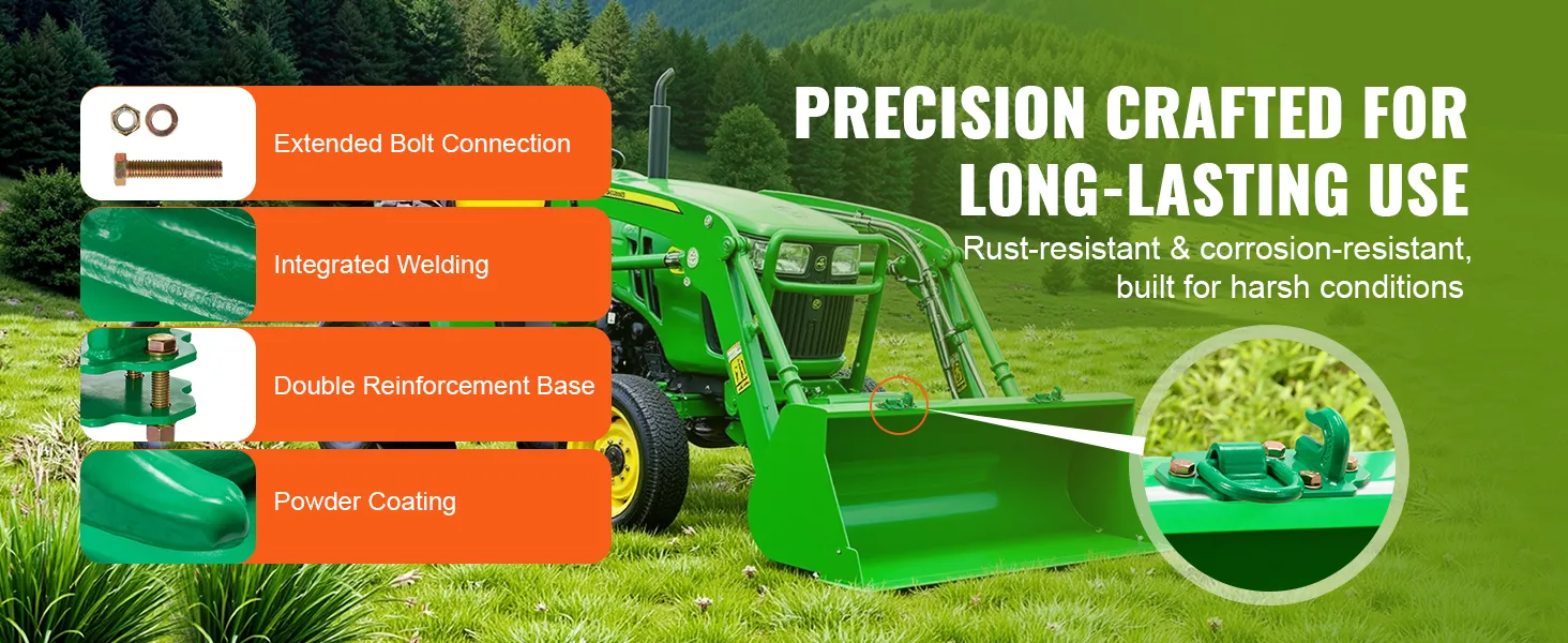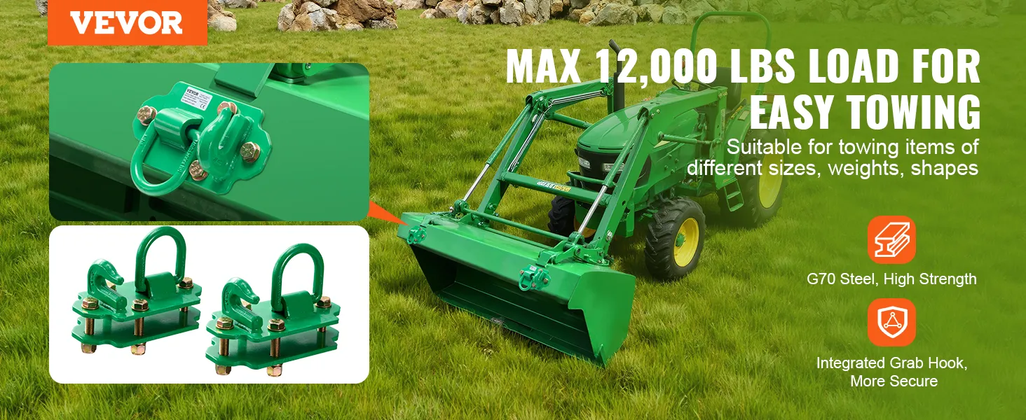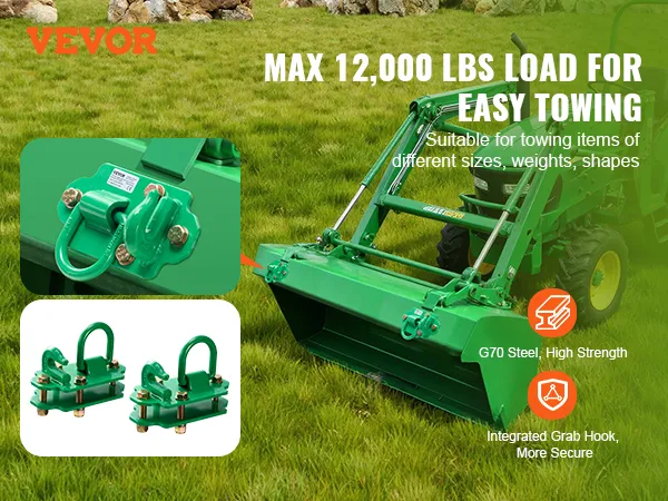 Duurzaam en betrouwbaar: de tractorhaken zijn voorzien van nauwkeurige structurele verbindingen en zijn beveiligd met een dubbele basis om stabiliteit tijdens het slepen te garanderen. Het oppervlak is bedekt met groen poeder voor een betere bescherming, waardoor het roestbestendig is en bestand is tegen barre weersomstandigheden. Dit robuuste ontwerp verlengt de levensduur en zorgt voor langdurige betrouwbaarheid in veeleisende omgevingen.
