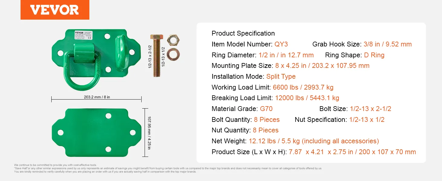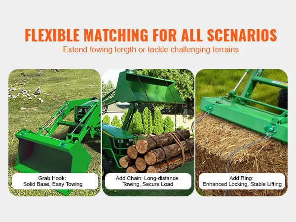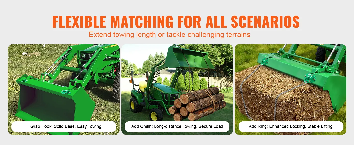 De tractorgrijphaken gebruiken een standaard kettingmaat van 9,52 mm en zijn compatibel met de meeste voertuigen, zoals landbouwvoertuigen, tractorbakken en terreinvoertuigen.