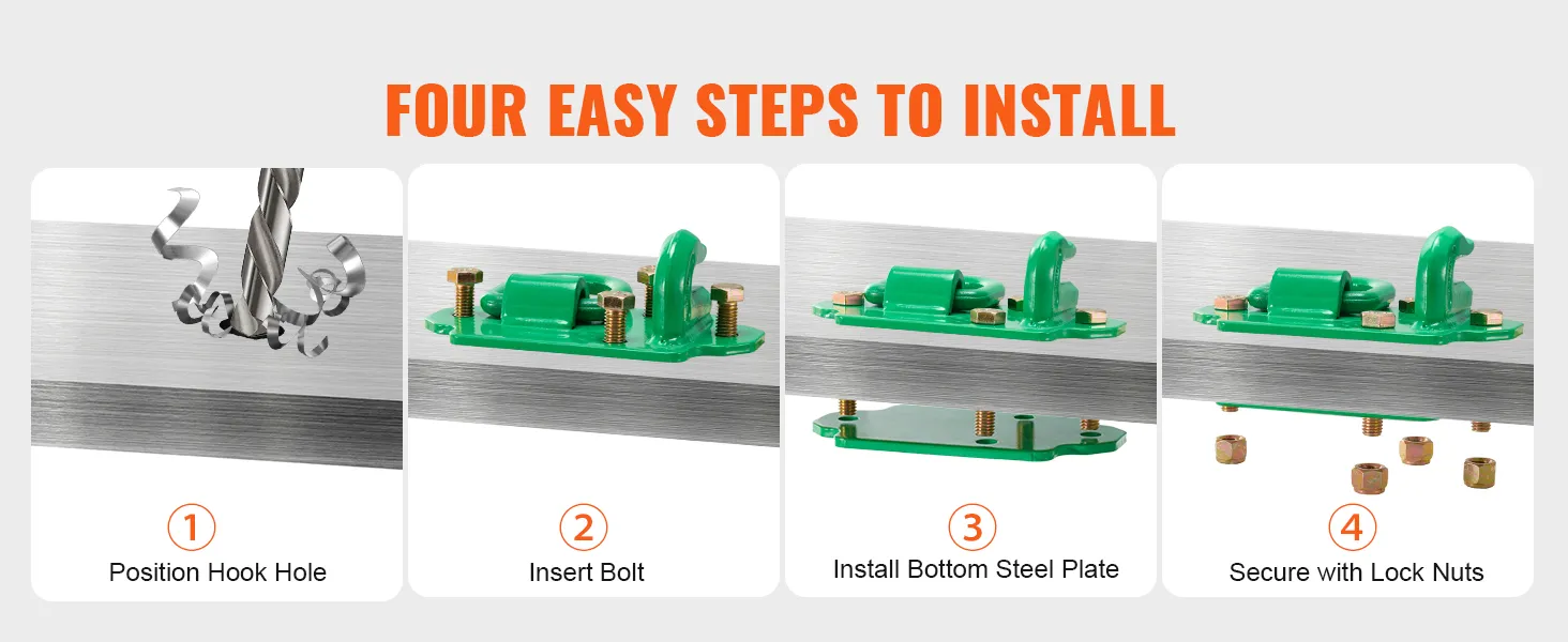 Eenvoudige installatie: de tractorgrijphaken zijn compatibel met kettingen van 3/8"/9,52 mm en passen op de meeste voertuigen, inclusief landbouwvoertuigen, tractorbakken en terreinvoertuigen. Ze zijn eenvoudig te monteren en te demonteren, waardoor ze gemakkelijk te gebruiken zijn zonder boren of extern gereedschap. Het installatieproces bestaat uit slechts vier eenvoudige stappen, waardoor het voor iedereen gebruiksvriendelijk en efficiënt is.