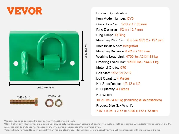 VEVOR 5/16" Tractor Bucket Hook with Tie Down Ring, Grade 70 Forged Steel 2 Pack Bolt-On Grab Hook with Back Plate Compatible for Tractor Bucket RV UTV Truck, Maximum Break Strength 12,000 lbs, Green
