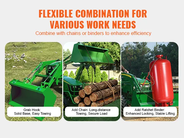 Flexible & Efficient: This tractor bucket grab hook supports various applications, allowing users to choose between standalone towing or using it in combination with chains and shackles. By increasing towing length or stabilizing loads, it effectively navigates complex terrains, enhancing overall work efficiency. This adaptability makes it a valuable tool for diverse tasks.
