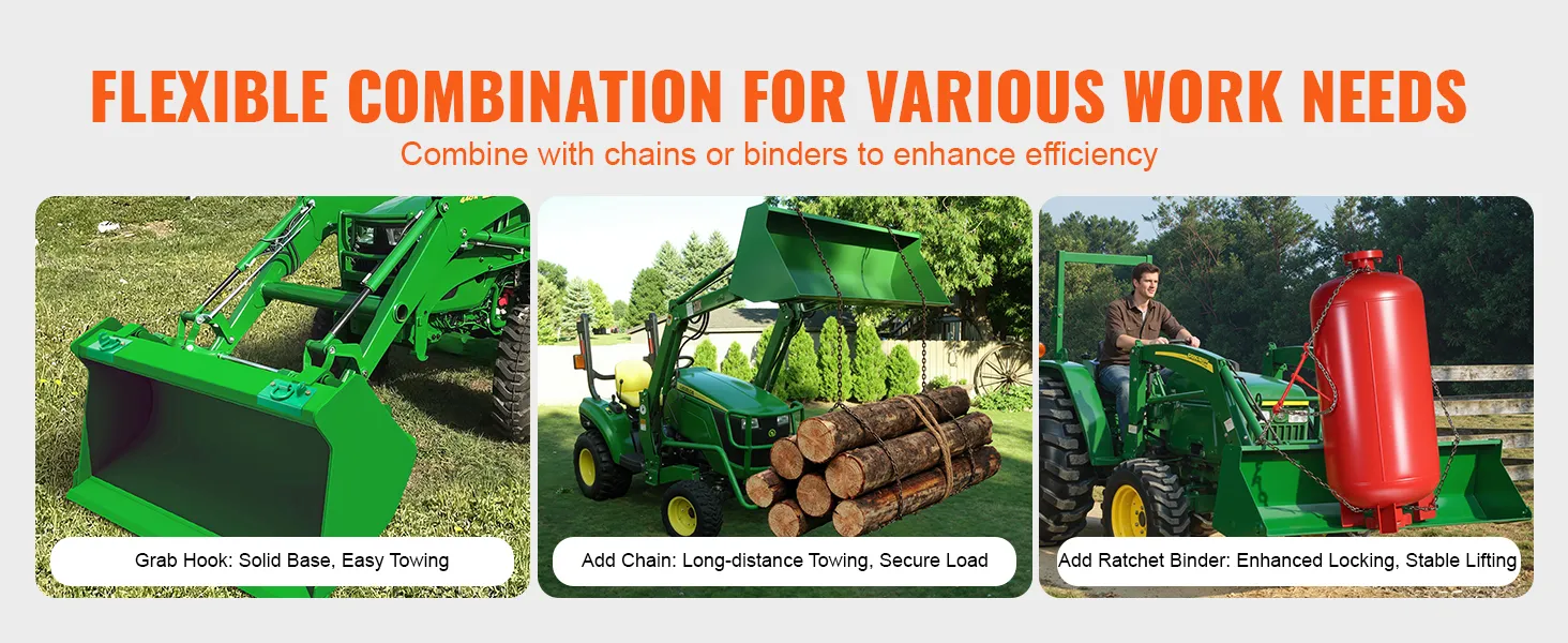 This tractor bucket grab hook can be used alone or in a combination of the towing hook, shackle with chains or ratchet binders. This versatility allows for quick towing, handling, and securing tasks, ensuring efficiency in operations.