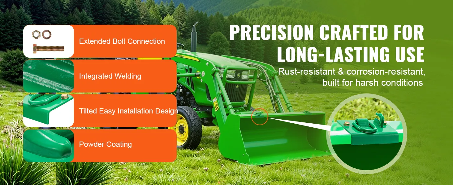 High Load Capacity: The tractor bucket hooks are made from G70-grade steel, providing high strength and wear resistance, with a maximum load capacity of 12,000 lbs. It has a wide towing range and can accommodate various sizes, weights, and shapes of towed objects, making it easy and quick to complete towing tasks.