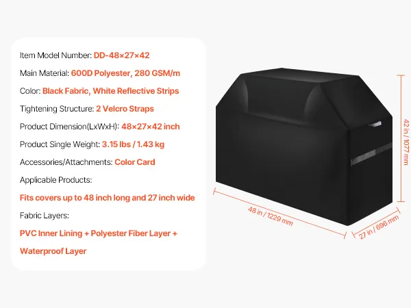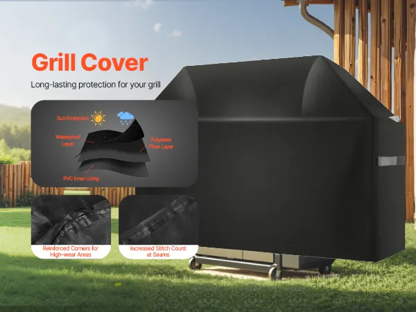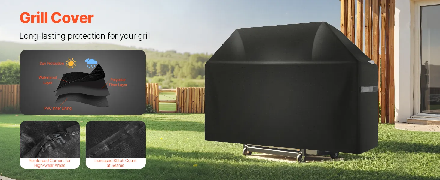 Constructed with 3 layers of high-quality materials: PVC lining, polyester fiber layer, and waterproof layer. This barbecue cover provides water resistance. The four corners are reinforced to resist wear and tear. The stitching is closely woven to enhance the waterproof performance.