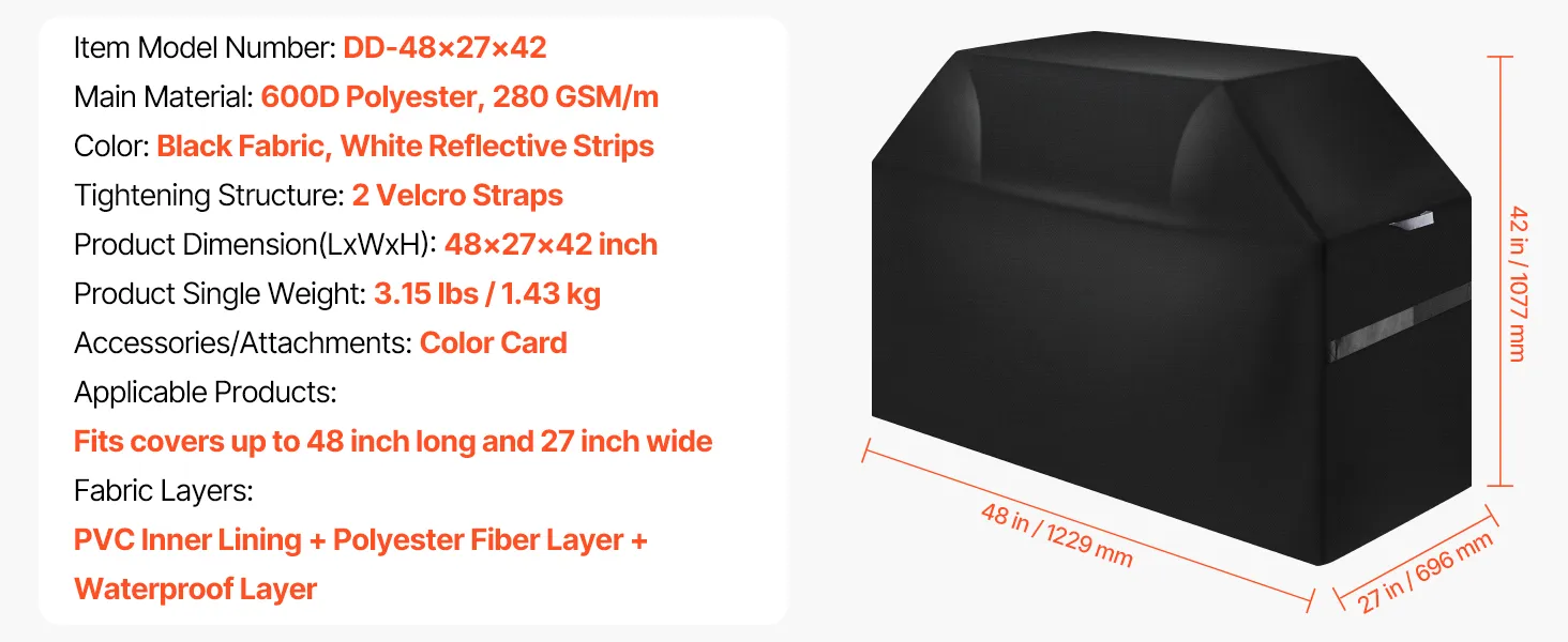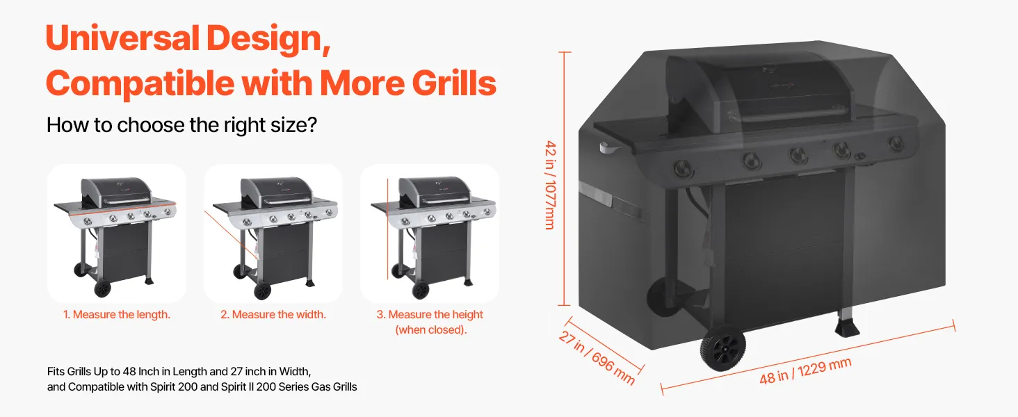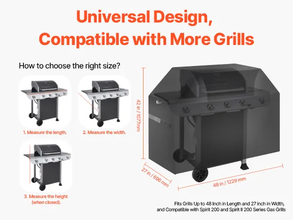 Wide Compatibility Sizes: The bbq gas grill cove dimension is 48x27x42 inch. The universal grill cover fits most grills. Simply measure your grill to find the perfect-fitting cover. NOTE: This product does not include a grill