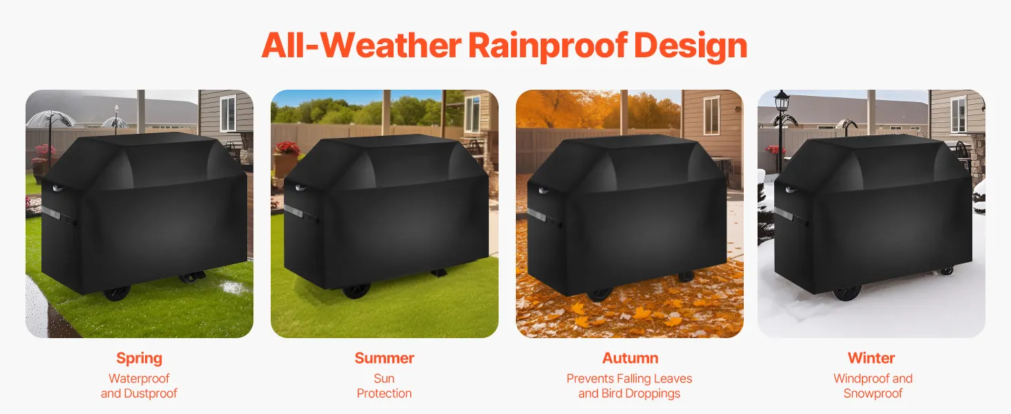 Multi-Layer Waterproof Upgrade: The barbecue cover uses a PVC lining + polyester fiber layer + waterproof layer, with all seams reinforced with waterproof strips and coated with sealing glue. It provides five layers of waterproof guard, with water resistance up to 800cmH2O. It completely blocks rainwater penetration, offering full guard for your grill and extending its lifespan
