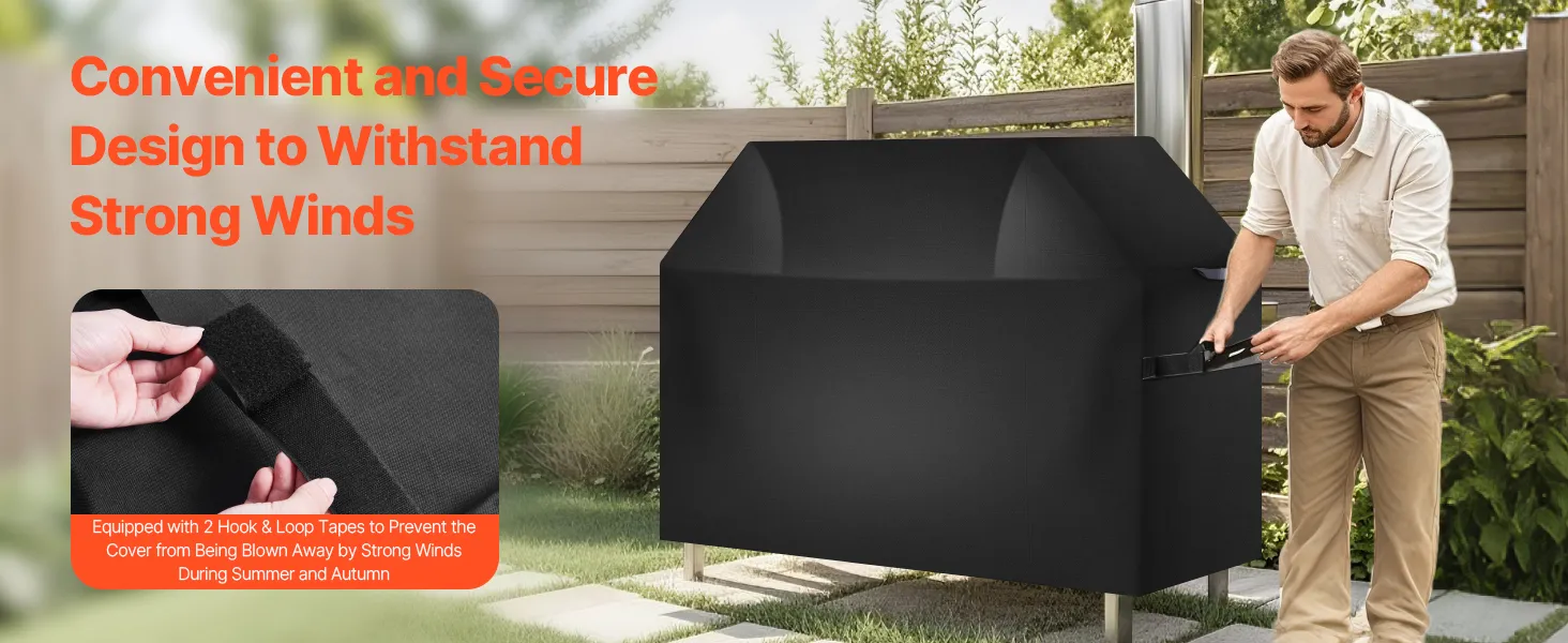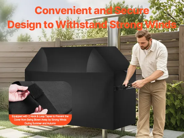 No more worrying about your grill cover blowing away during strong winds in the summer or autumn! This polyester easy on off cover is equipped with 2 pairs of hook & loop tapes for a quick, snug fit. Multiple windproof features ensure that your cover stays securely in place.