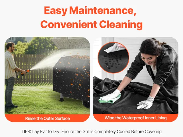 Simply rinse the outer surface and wipe the waterproof inner lining to easily remove stain. After cleaning, lay it flat to dry and it's ready for reuse. Tip: To extend the life of your grill cover, ensure your grill is completely cool before covering it.