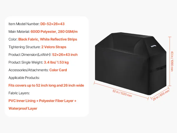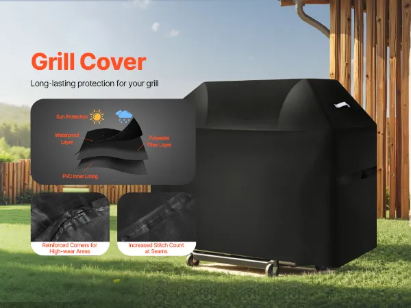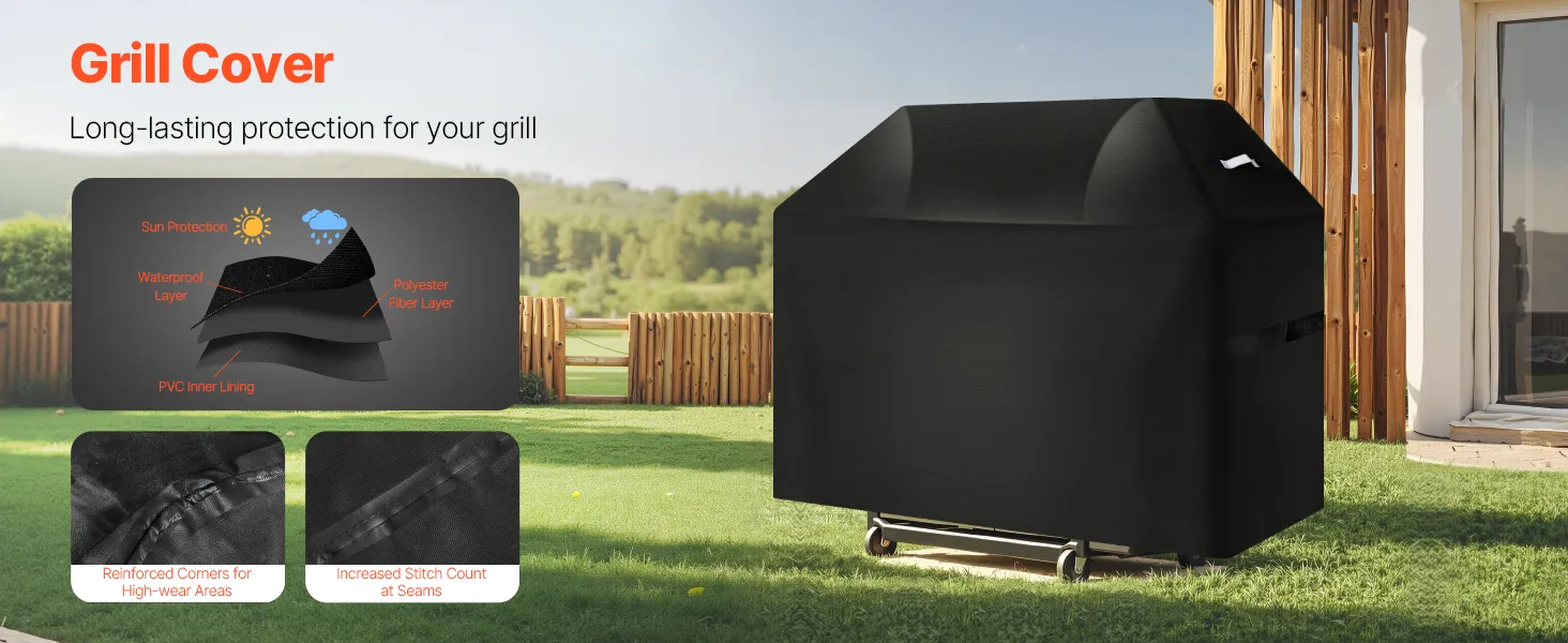 Constructed with 3 layers of high-quality materials: PVC lining, polyester fiber layer, and waterproof layer. This barbecue cover provides water resistance. The four corners are reinforced to resist wear and tear. The stitching is closely woven to enhance the waterproof performance.
