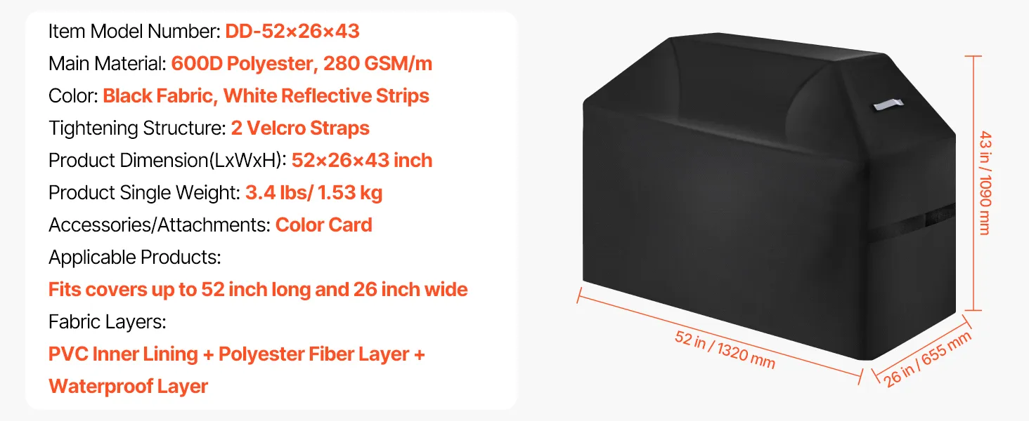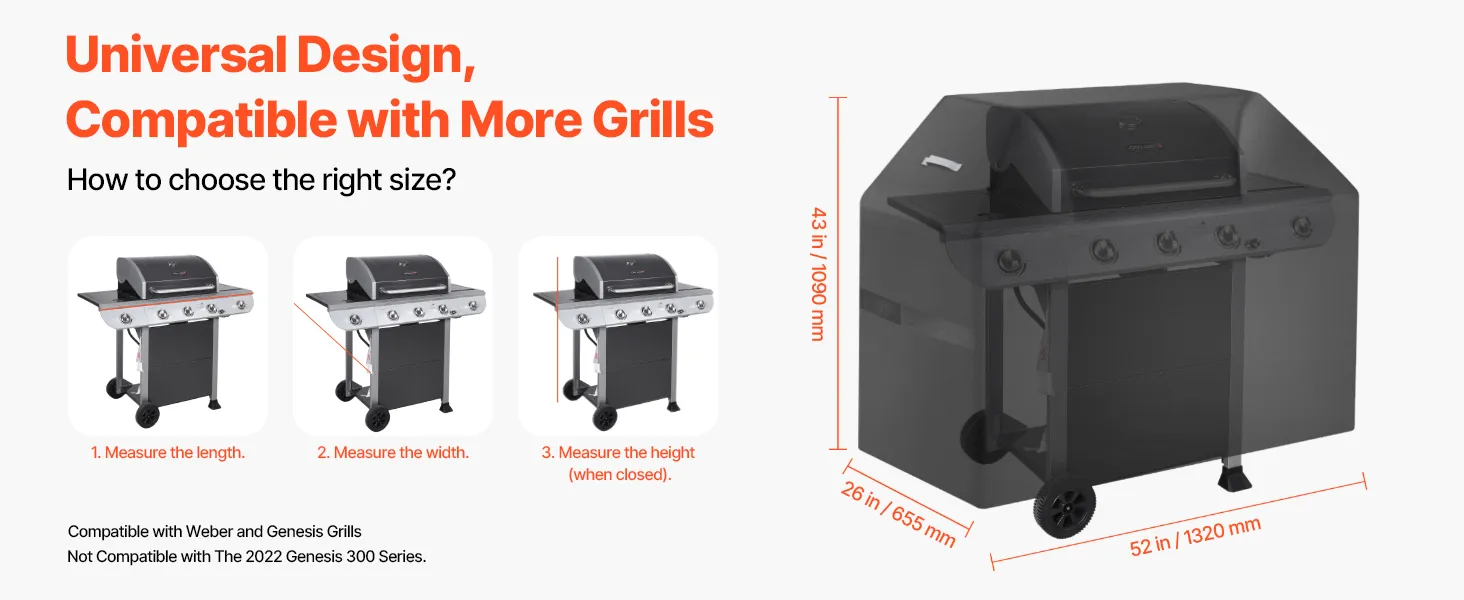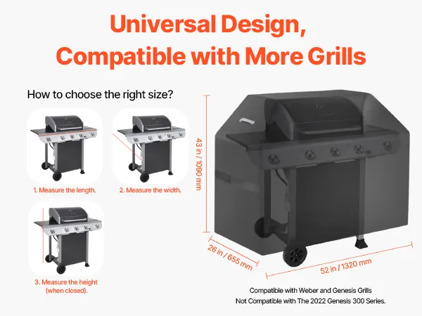 Wide Compatibility Sizes: The bbq gas grill cove dimension is 52x26x43 inch / 1320x655x1090 mm. The universal grill cover fits most grills. Simply measure your grill to find the perfect-fitting cover. NOTE: This product does not include a grill