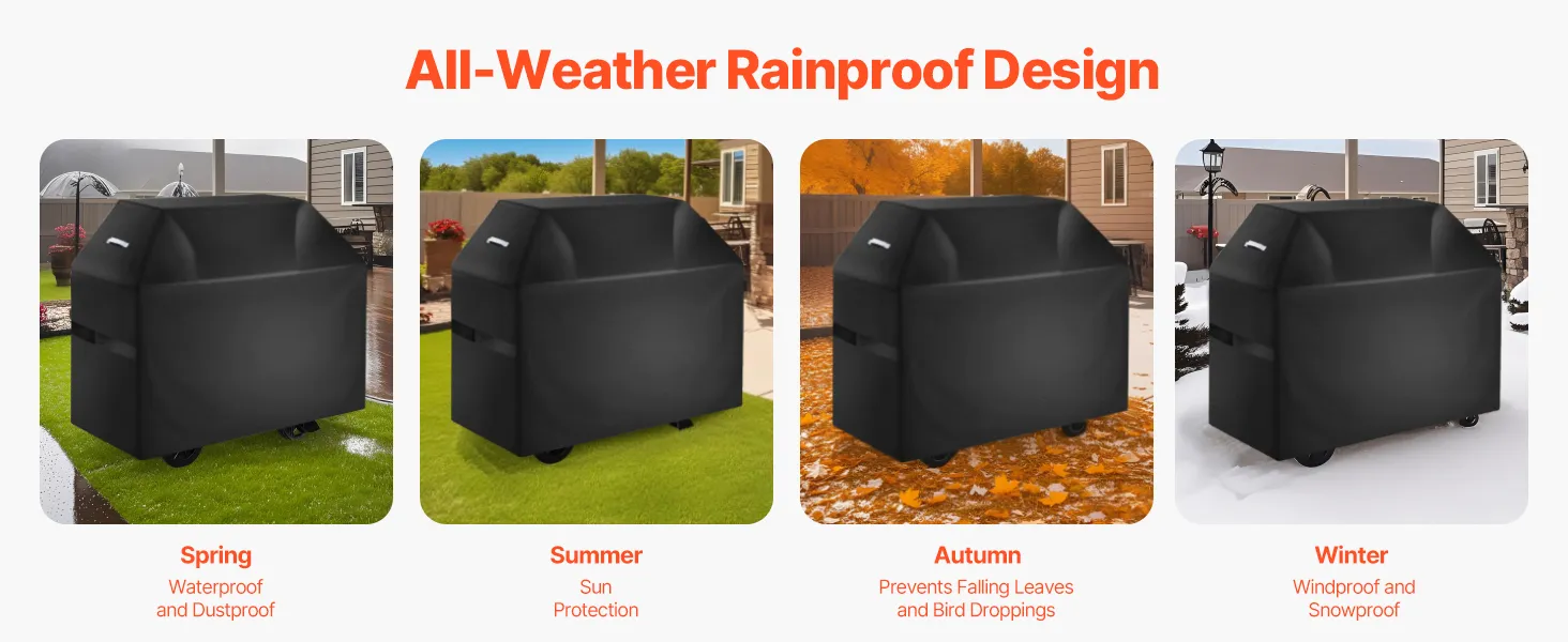 Multi-Layer Waterproof Upgrade: The barbecue cover uses a PVC lining + polyester fiber layer + waterproof layer, with all seams reinforced with waterproof strips and coated with sealing glue. It provides five layers of waterproof guard, with water resistance up to 800cmH2O. It completely blocks rainwater penetration, offering full guard for your grill and extending its lifespan
