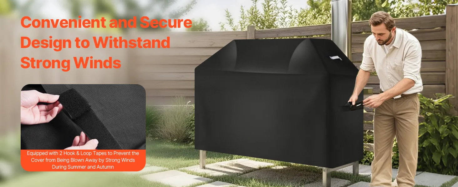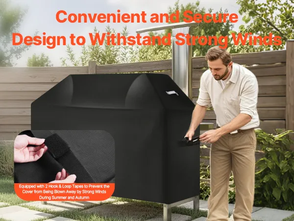 No more worrying about your grill cover blowing away during strong winds in the summer or autumn! This polyester easy on off cover is equipped with 2 pairs of hook & loop tapes for a quick, snug fit. Multiple windproof features ensure that your cover stays securely in place.