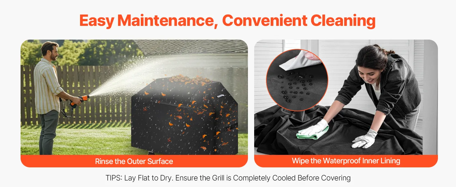 Simply rinse the outer surface and wipe the waterproof inner lining to easily remove stain. After cleaning, lay it flat to dry and it's ready for reuse. Tip: To extend the life of your grill cover, ensure your grill is completely cool before covering it.