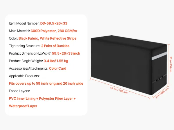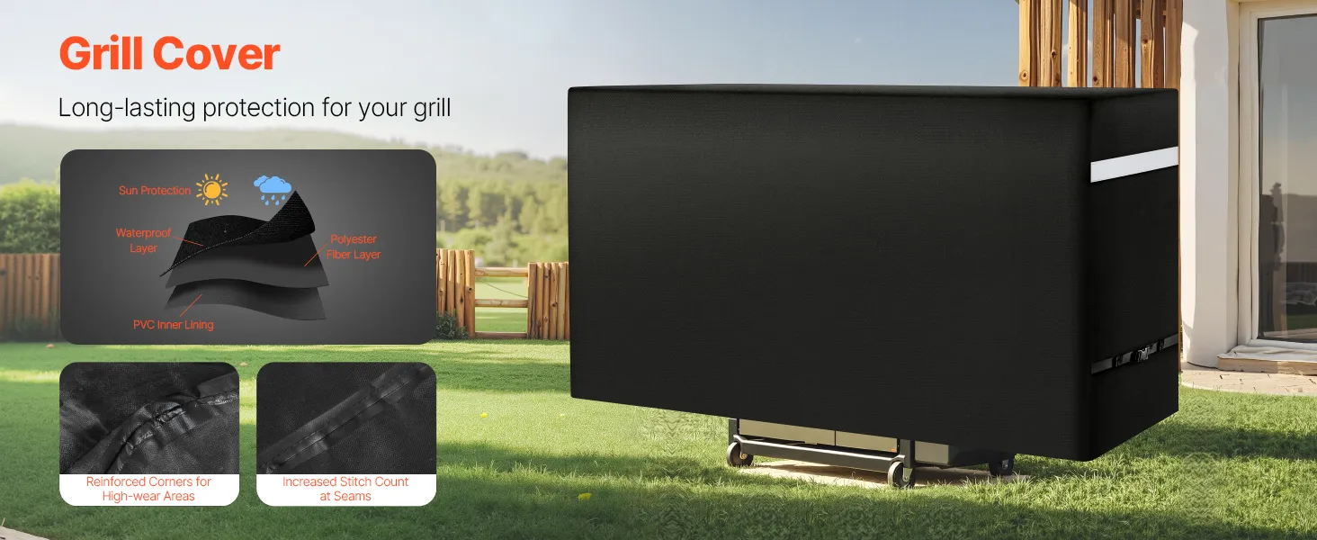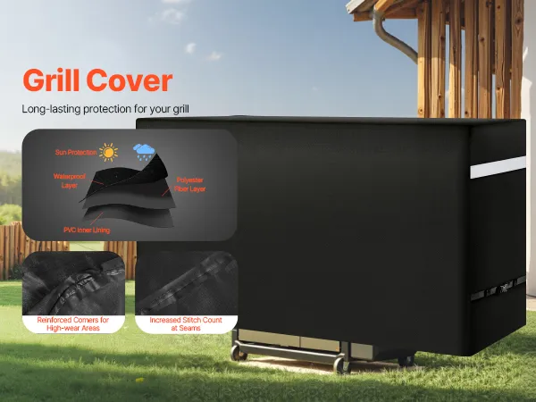 Constructed with 3 layers of high-quality materials: PVC lining, polyester fiber layer, and waterproof layer. This barbecue cover provides water resistance. The four corners are reinforced to resist wear and tear. The stitching is closely woven to enhance the waterproof performance.