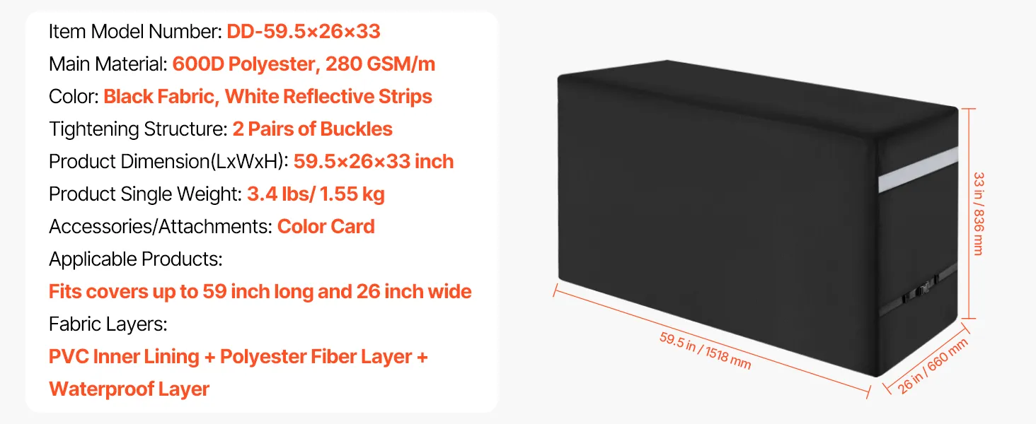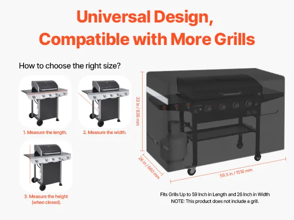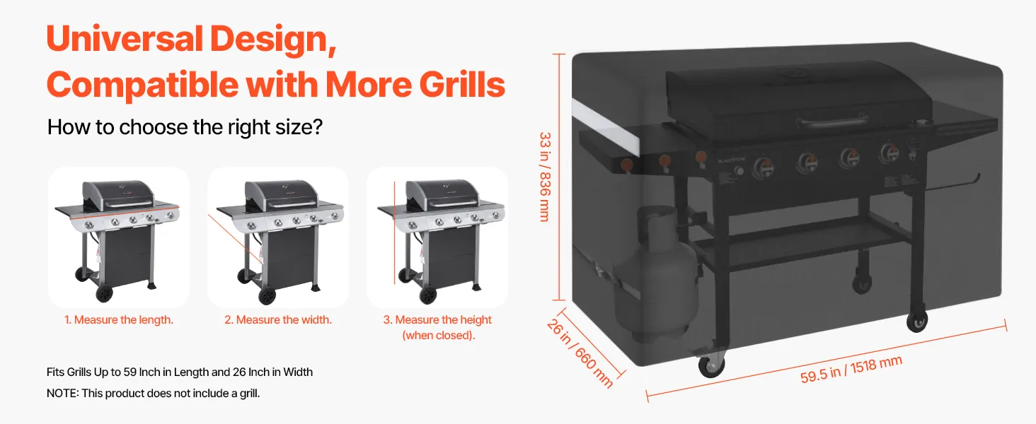 Wide Compatibility Sizes: The bbq gas grill cove dimension is 59.5x26x33 inch / 1518x660x836 mm. The universal grill cover fits most grills. Simply measure your grill to find the perfect-fitting cover. NOTE: This product does not include a grill
