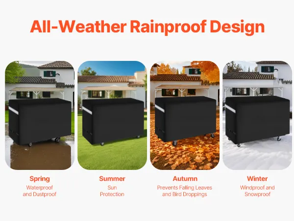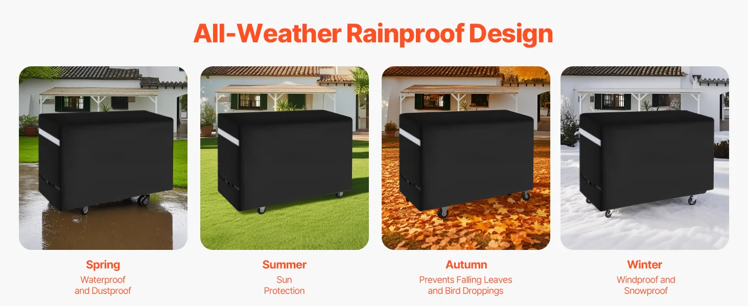 Multi-Layer Waterproof Upgrade: The barbecue cover uses a PVC lining + polyester fiber layer + waterproof layer, with all seams reinforced with waterproof strips and coated with sealing glue. It provides five layers of waterproof guard, with water resistance up to 800cmH2O. It completely blocks rainwater penetration, offering full guard for your grill and extending its lifespan