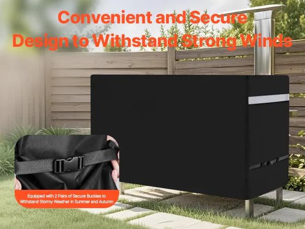 No more worrying about your grill cover blowing away during strong winds in the summer or autumn! This polyester easy on off cover is equipped with 2 pairs of secure buckles for a quick, snug fit. Multiple windproof features ensure that your cover stays securely in place.