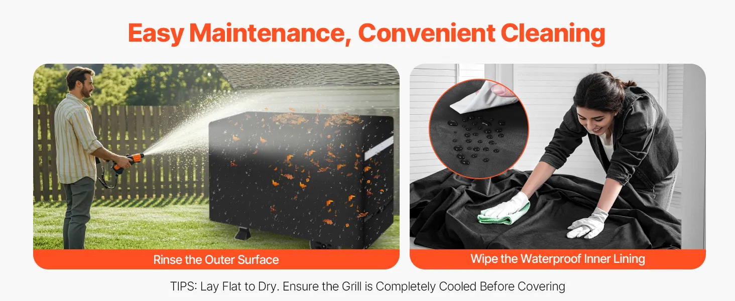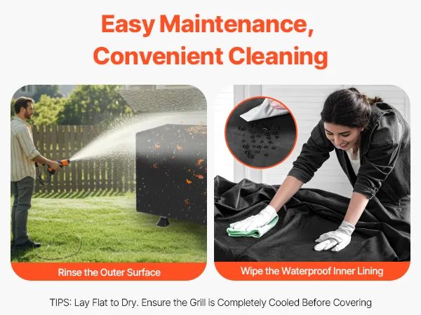 Simply rinse the outer surface and wipe the waterproof inner lining to easily remove stain. After cleaning, lay it flat to dry and it's ready for reuse. Tip: To extend the life of your grill cover, ensure your grill is completely cool before covering it.