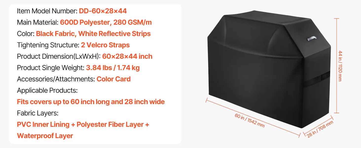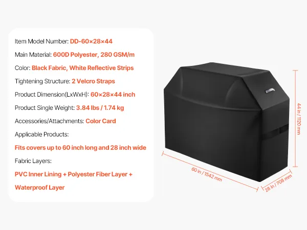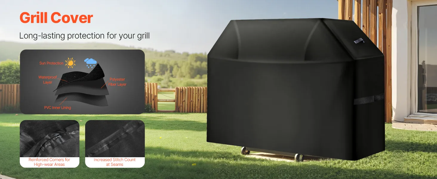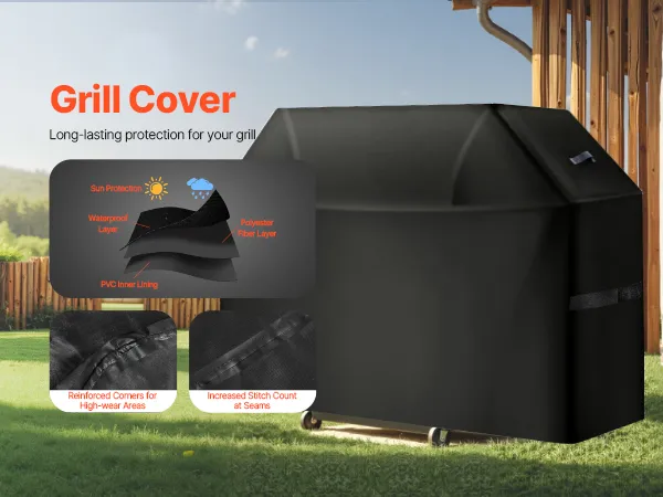 Constructed with 3 layers of high-quality materials: PVC lining, polyester fiber layer, and waterproof layer. This barbecue cover provides water resistance. The four corners are reinforced to resist wear and tear. The stitching is closely woven to enhance the waterproof performance.