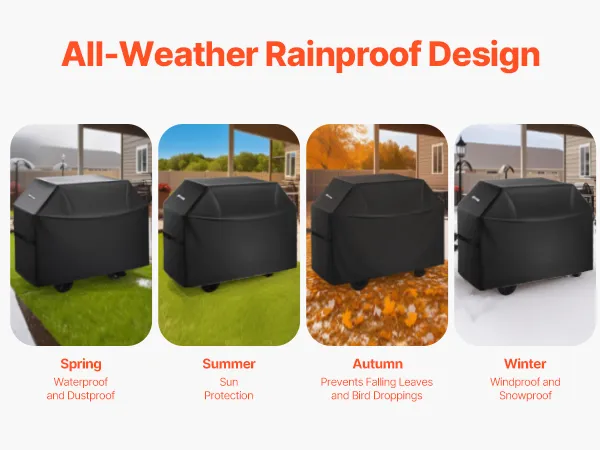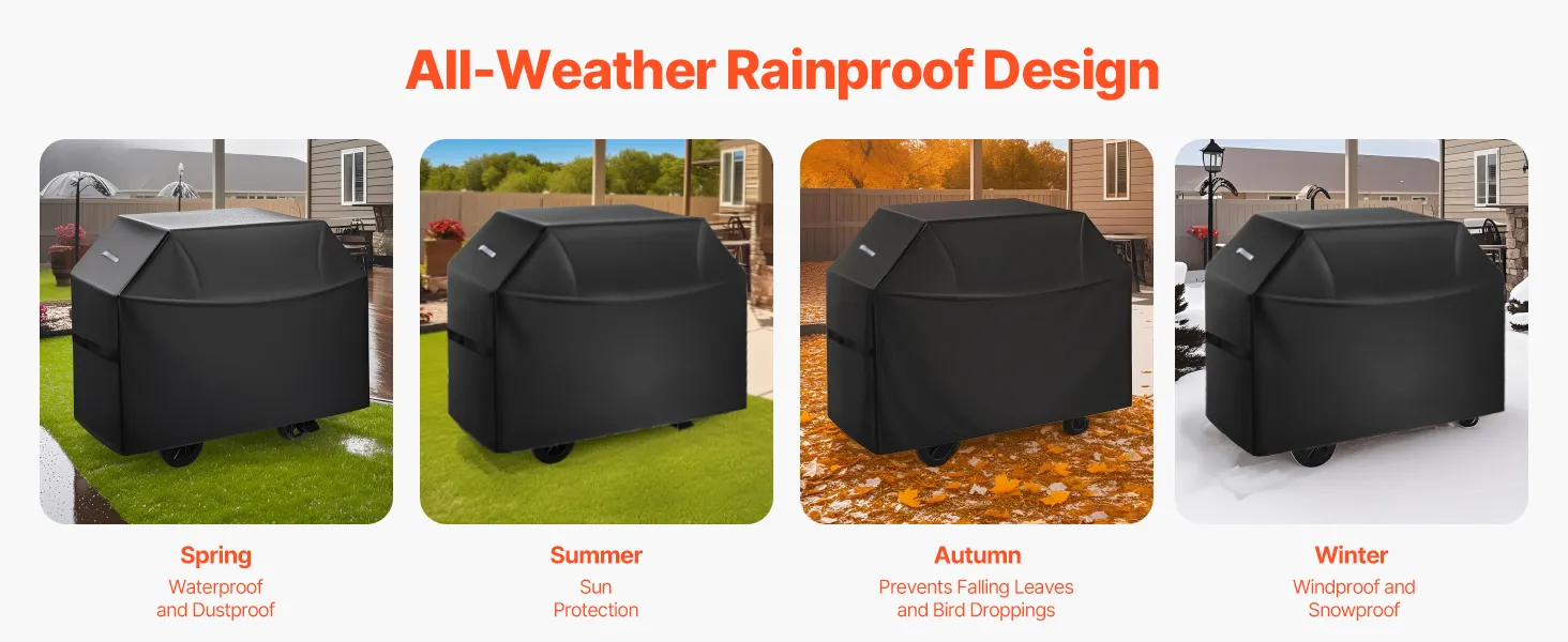 Multi-Layer Waterproof Upgrade: The barbecue cover uses a PVC lining + polyester fiber layer + waterproof layer, with all seams reinforced with waterproof strips and coated with sealing glue. It provides five layers of waterproof guard, with water resistance up to 800cmH2O. It completely blocks rainwater penetration, offering full guard for your grill and extending its lifespan