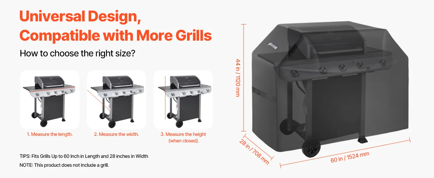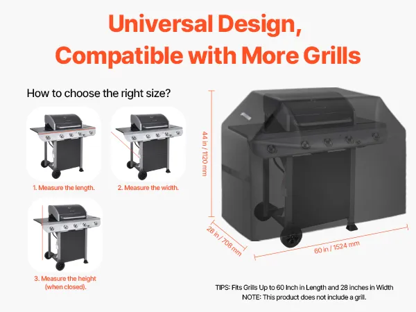 Wide Compatibility Sizes: The bbq gas grill cove dimension is 60x28x44 inch / 1524x708x1120 mm. The universal grill cover fits most grills. Simply measure your grill to find the perfect-fitting cover. NOTE: This product does not include a grill