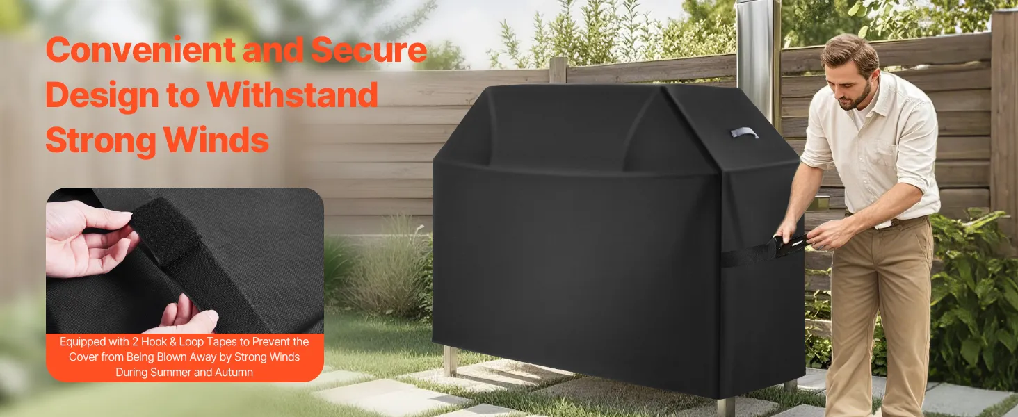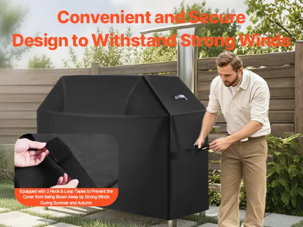 No more worrying about your grill cover blowing away during strong winds in the summer or autumn! This polyester easy on off cover is equipped with 2 pairs of hook & loop tapes for a quick, snug fit. Multiple windproof features ensure that your cover stays securely in place.