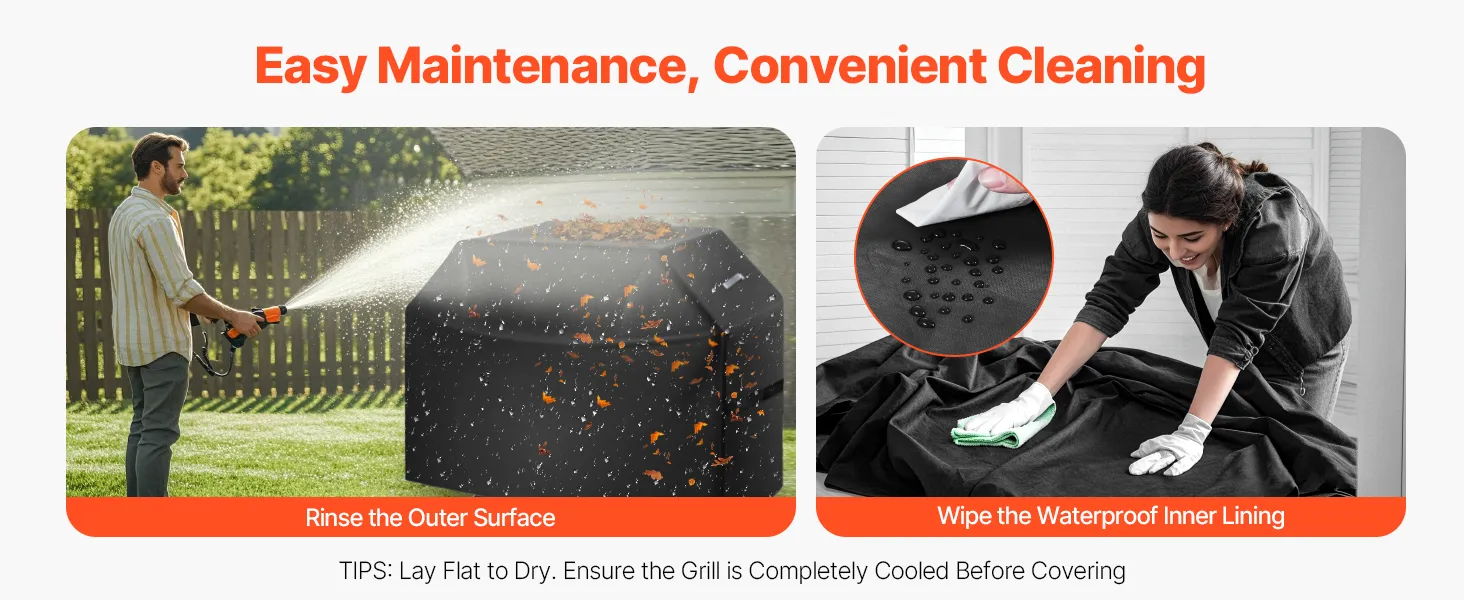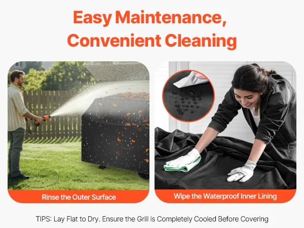 Simply rinse the outer surface and wipe the waterproof inner lining to easily remove stain. After cleaning, lay it flat to dry and it's ready for reuse. Tip: To extend the life of your grill cover, ensure your grill is completely cool before covering it.