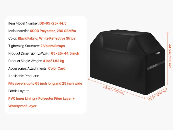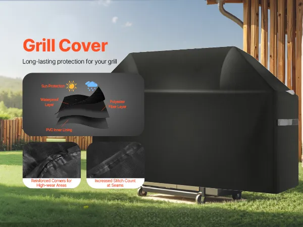 Constructed with 3 layers of high-quality materials: PVC lining, polyester fiber layer, and waterproof layer. This barbecue cover provides water resistance. The four corners are reinforced to resist wear and tear. The stitching is closely woven to enhance the waterproof performance.
