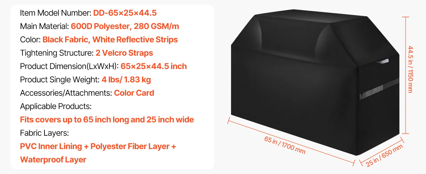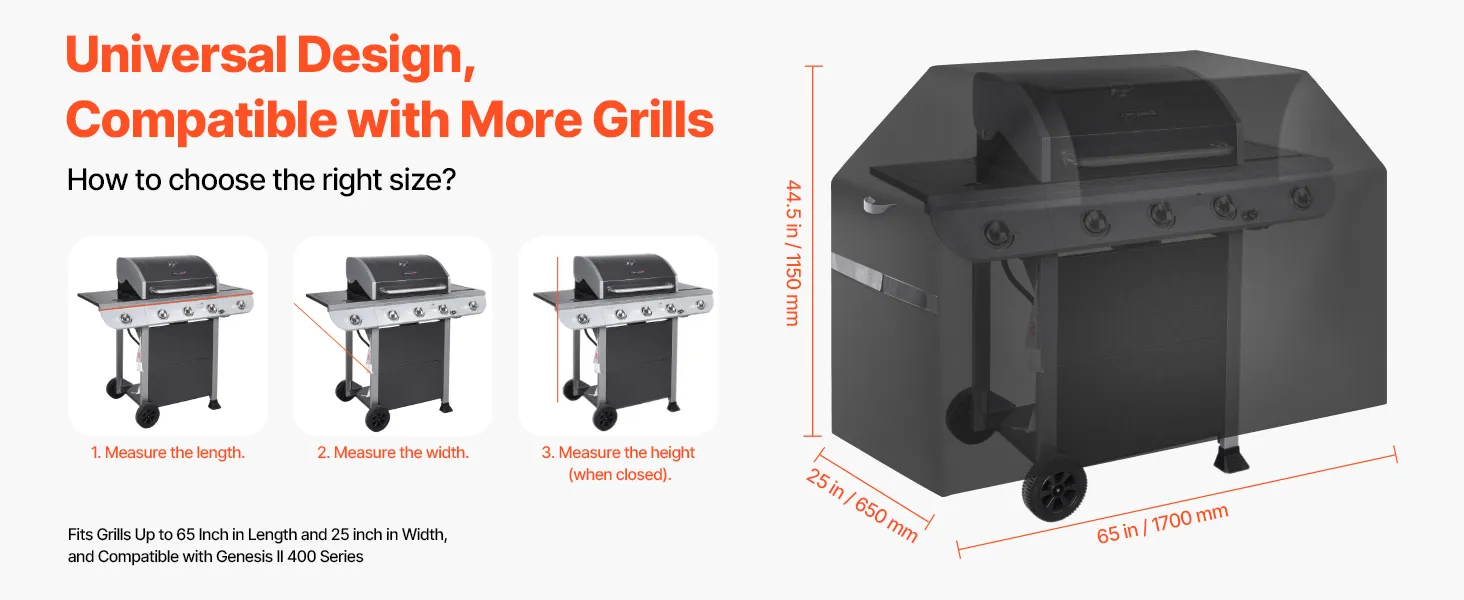 Wide Compatibility Sizes: The bbq gas grill cove dimension is 65x25x44.5 inch. The universal grill cover fits most grills. Simply measure your grill to find the perfect-fitting cover. NOTE: This product does not include a grill