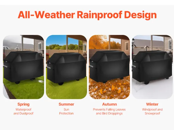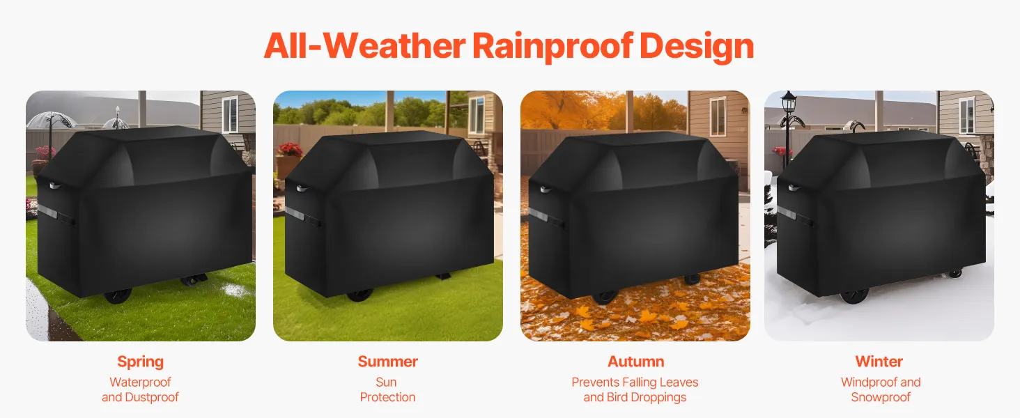 Multi-Layer Waterproof Upgrade: The barbecue cover uses a PVC lining + polyester fiber layer + waterproof layer, with all seams reinforced with waterproof strips and coated with sealing glue. It provides five layers of waterproof guard, with water resistance up to 800cmH2O. It completely blocks rainwater penetration, offering full guard for your grill and extending its lifespan