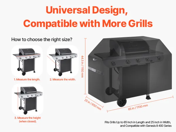 Universal design compatible with most grills. Simply measure the width, height, and depth of your grill to choose the right size. This grill cover for outdoor grill is a perfect fit for your BBQ equipment.