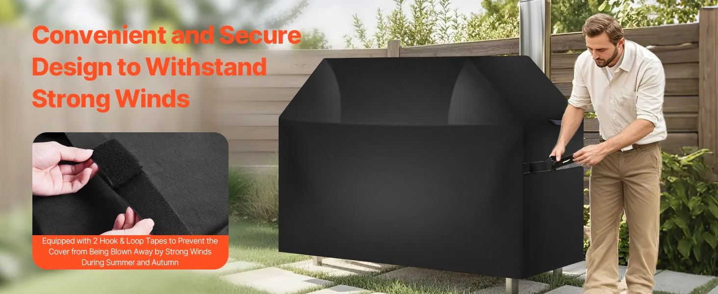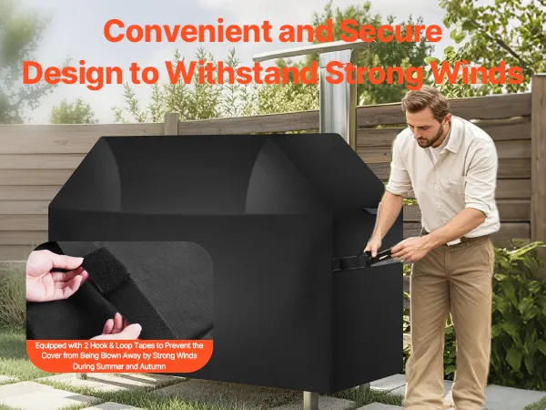 No more worrying about your grill cover blowing away during strong winds in the summer or autumn! This polyester easy on off cover is equipped with 2 pairs of hook & loop tapes for a quick, snug fit. Multiple windproof features ensure that your cover stays securely in place.
