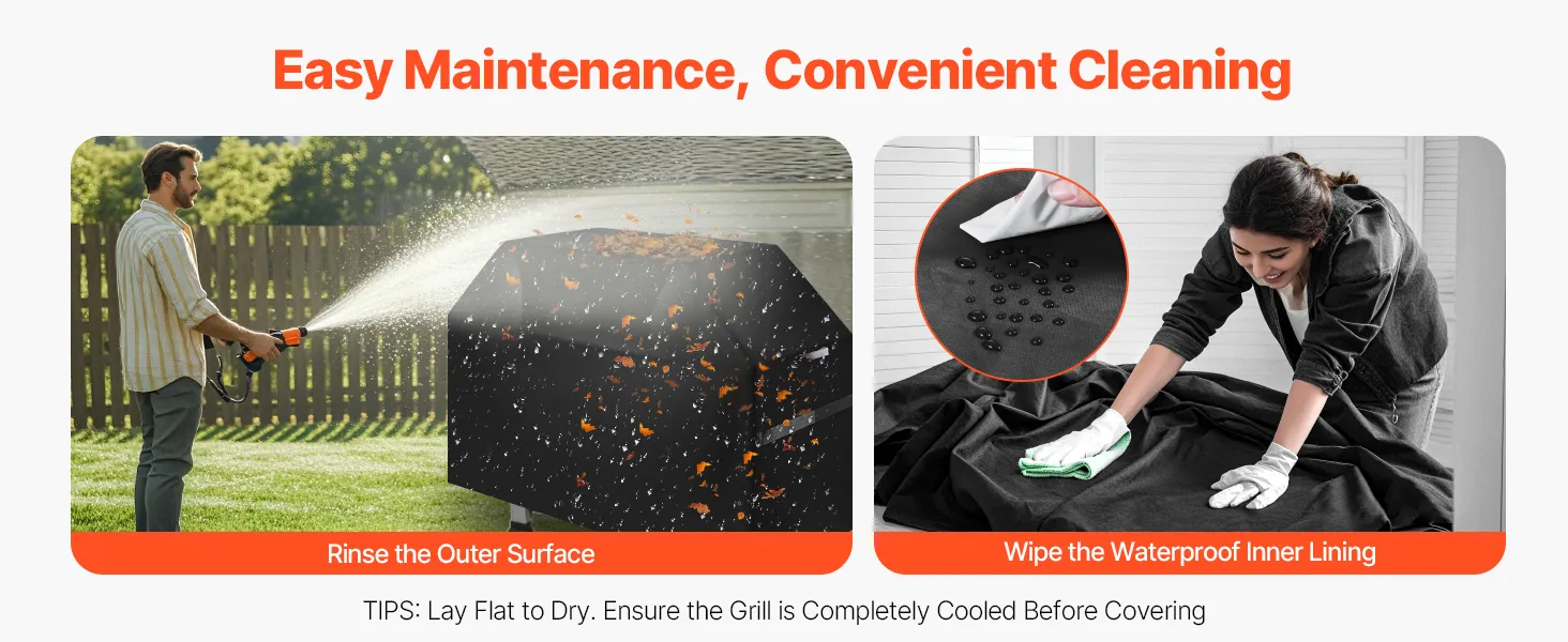 Simply rinse the outer surface and wipe the waterproof inner lining to easily remove stain. After cleaning, lay it flat to dry and it's ready for reuse. Tip: To extend the life of your grill cover, ensure your grill is completely cool before covering it.