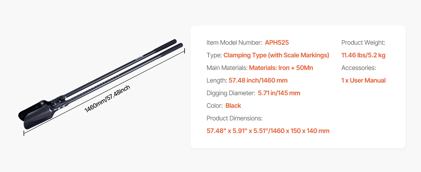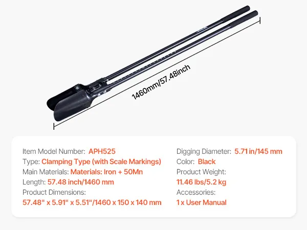 This post hole digger is ideal for gardening and farming, easily digging 5.71"/145 mm round holes. The metal handle and metal blade cut tough soil, while the 57.48"/1460 mm length reduces bending. Lightweight, portable, and ready to use, it enhances work efficiency.