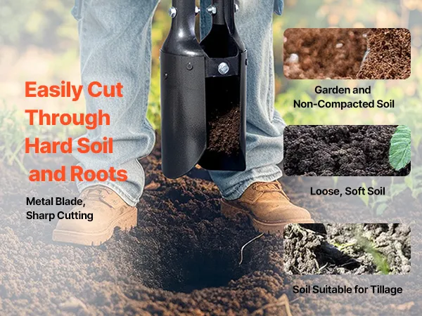 Our heavy duty post hole digger features a metal blade made of high-quality 50Mn carbon steel, which easily cuts through tough soil and stubborn roots, enhancing your gardening efficiency. It is designed specifically for loose soil and cultivable land.