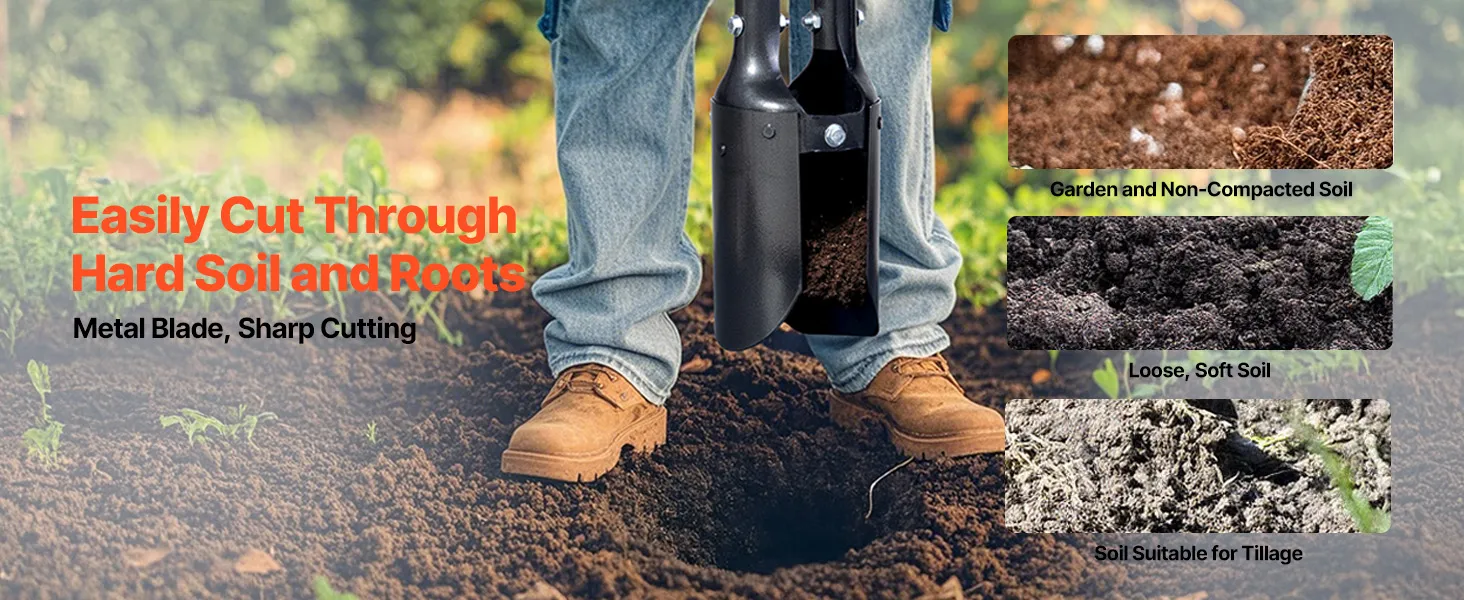 Durable and Sturdy: The handle of our post hole digger is made from Q235 carbon steel, 0.12-inch/3 mm thick, paired with a 50Mn steel metal blade. It's suitable for various soil types, such as loose soft soil and cultivable land.