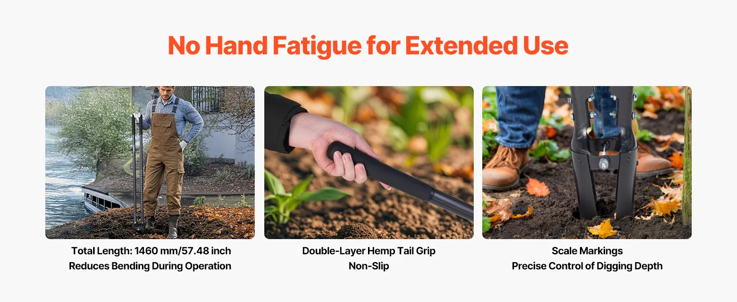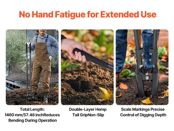 With a total length of 57.48 in/1460 mm, our manual hole digger reduces frequent bending. The double-layer hemp tail sleeve enhances grip comfort, and clear scale markings help you accurately gauge hole depth during digging.