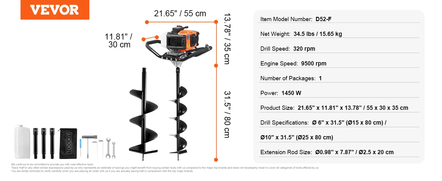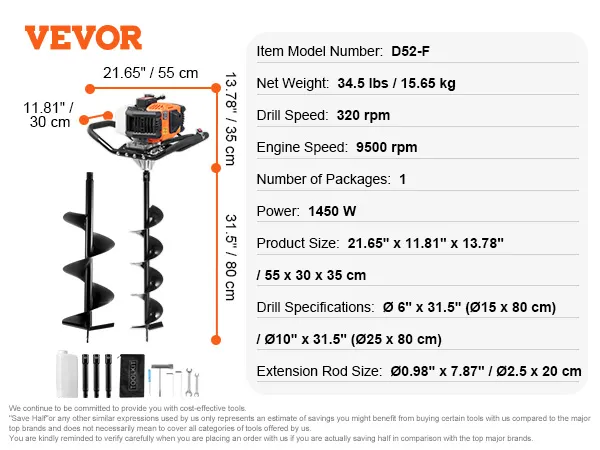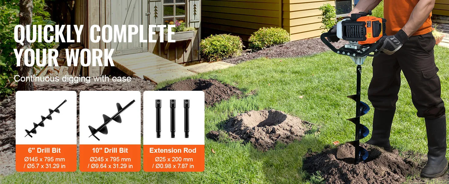 VEVOR 52CC 1450W benzine grondboor met 6-inch en 10-inch kernboren en 3 verlengstangen, paalhekgatenboor voor landbouwgrond, tuinplanten, oranje + zwart