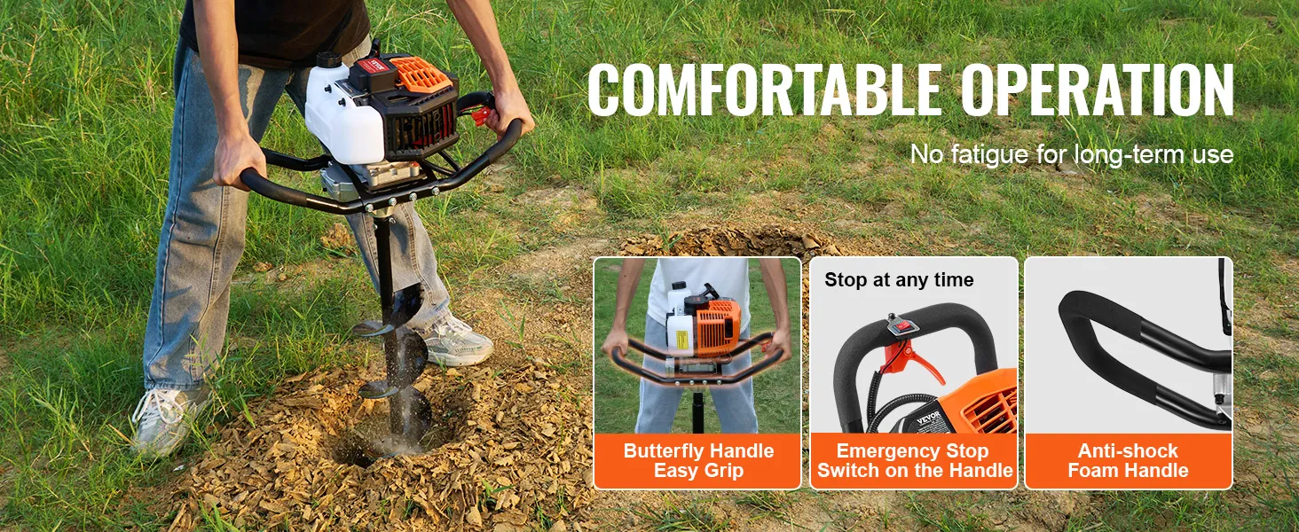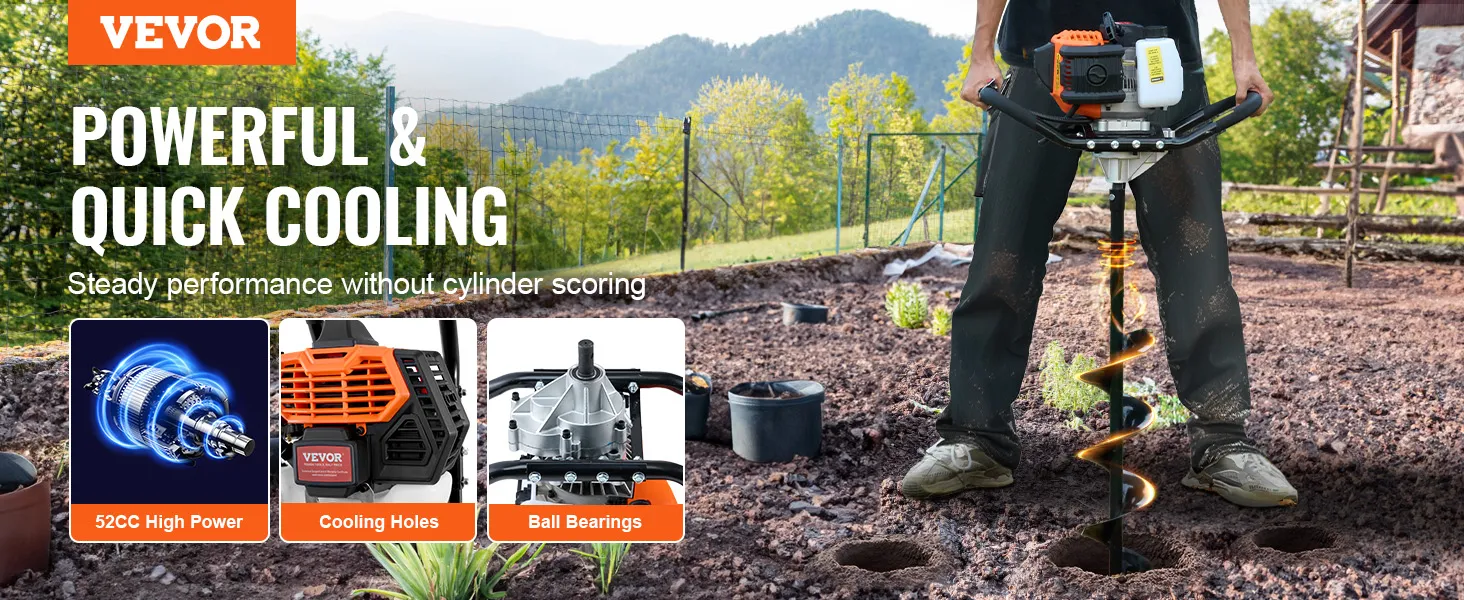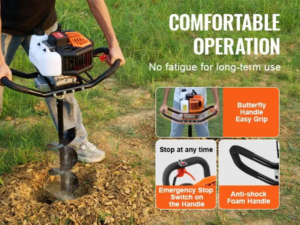 Sterk vermogen: uitgerust met een brandstofmotor met een cilinderinhoud van 52 cc, het vermogen bedraagt maximaal 1450 W, de snelheid kan 9500 tpm bereiken en de boor draait tot 32 tpm. Gecombineerd met het krachtige motorvermogen kan de boortaak snel worden uitgevoerd en kan hij gemakkelijk omgaan met allerlei soorten grond- en terreinomstandigheden, waardoor hij geschikt is voor zware werkzaamheden.