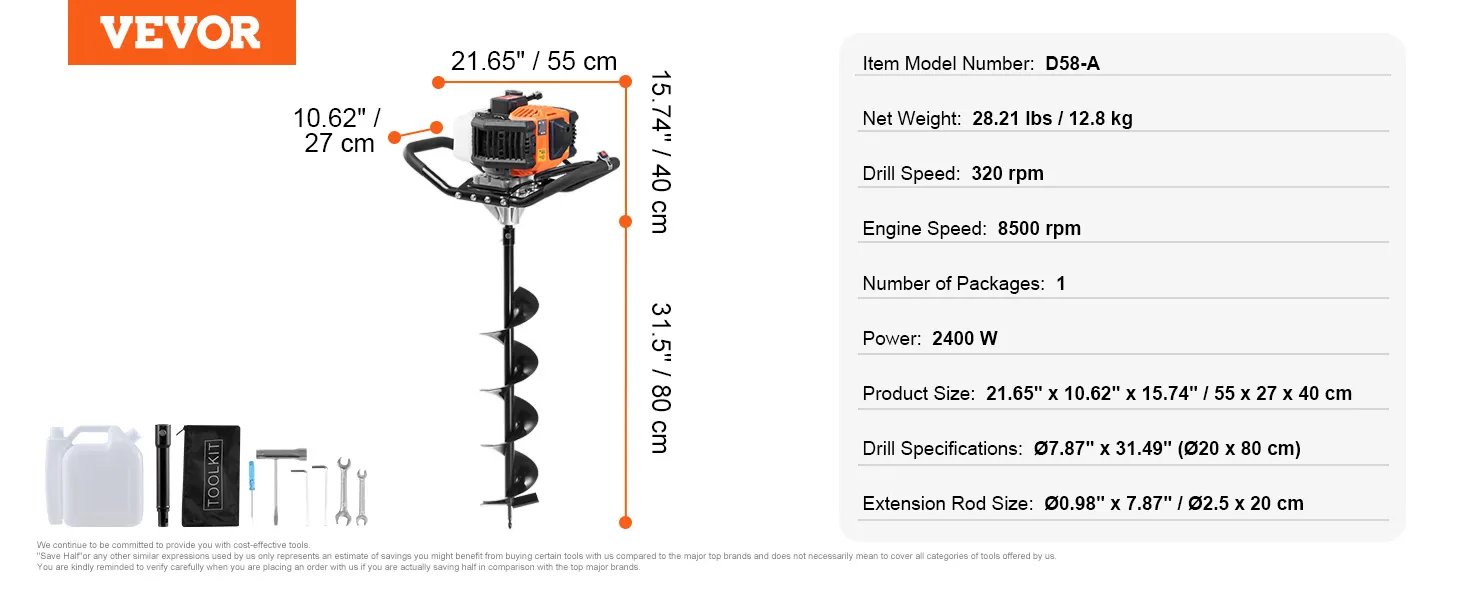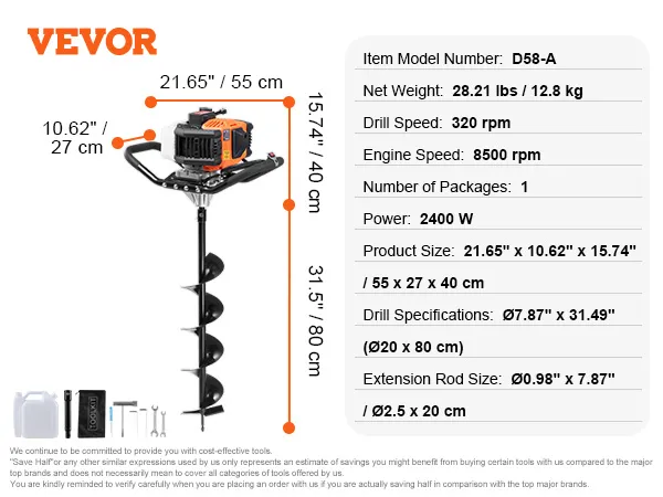 Duurzaam materiaal: de boor is gemaakt van gelegeerd staal met een gepoedercoat metalen oppervlak, sterke corrosie- en slijtvastheid, waardoor onderhoud en vervangingsfrequentie worden verminderd. Wij configureren voor u een boor van 200 mm en een verlengstuk, handig in gebruik. Grote motorkoelgaten om de motor lang te laten draaien.
